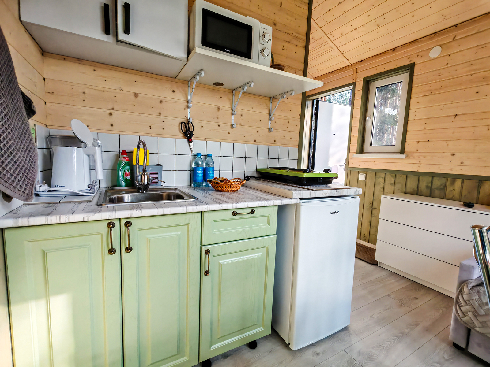В каждом коттедже два основных места + дополнительное место (раздвижной диван). Во внутренних интерьерах коттеджей использованы только натуральные северные хвойные материалы. Стены оформлены в спокойные оттенки цвета неба и цвета июньского ягеля, что беспроигрышно создаёт атмосферу спокойствия. Коттеджи, построенные по принципу «микро-дом» очень функциональны. Коттеджи построены в июле 2025, т.е. совсем новые.
