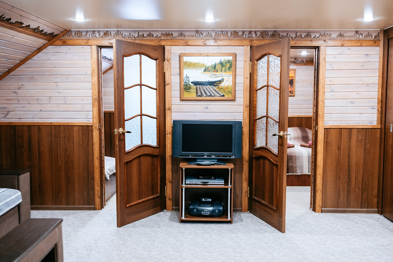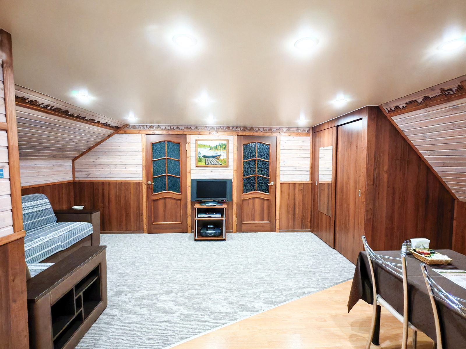 Большой холл с мягкой (раздвижной) мебелью. Шкаф купе. Уютный интерьер. Спутниковое телевидение, ЖК телевизор, DVD, караоке, музыкальный центр. Ламинат и теплые ковры. Картины с карельскими пейзажами создают атмосферу уюта.